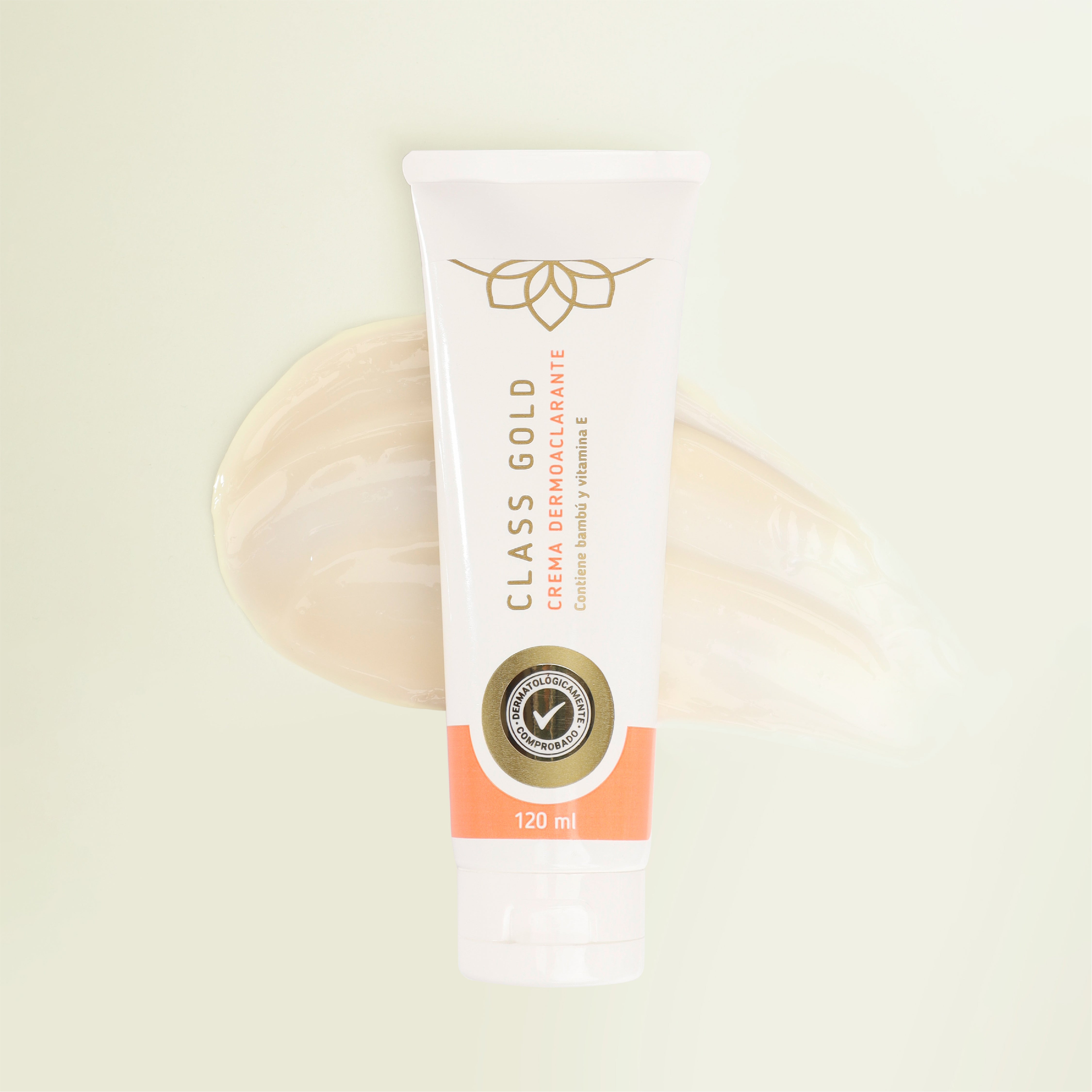 El Dermoaclarante Class Gold está formulado con ingredientes de alta calidad para ayudar a eliminar manchas oscuras, marcas y zonas con pigmentación irregular en el cuerpo. Su exclusiva combinación de activos actúa directamente sobre la melanina, brindando un tono más uniforme y una piel visiblemente más clara y saludable.